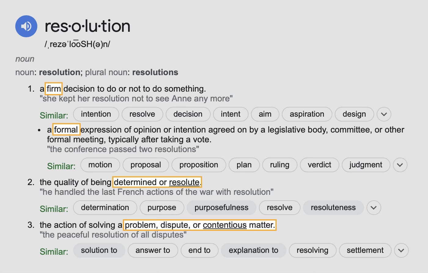Do you see what I see (and highlighted so you couldn’t miss)? Firm, formal, determined, problem, contentious… this is what we’re using as our roadmap into a new year? Making resolutions, essentially, is saying to yourself “You seriously screwed up 2023. You need to do better in 2024.” Which is why resolutions tend to be broad and vague, and are usually related to something you don’t like about yourself, and/or something you’ve failed at in the past.